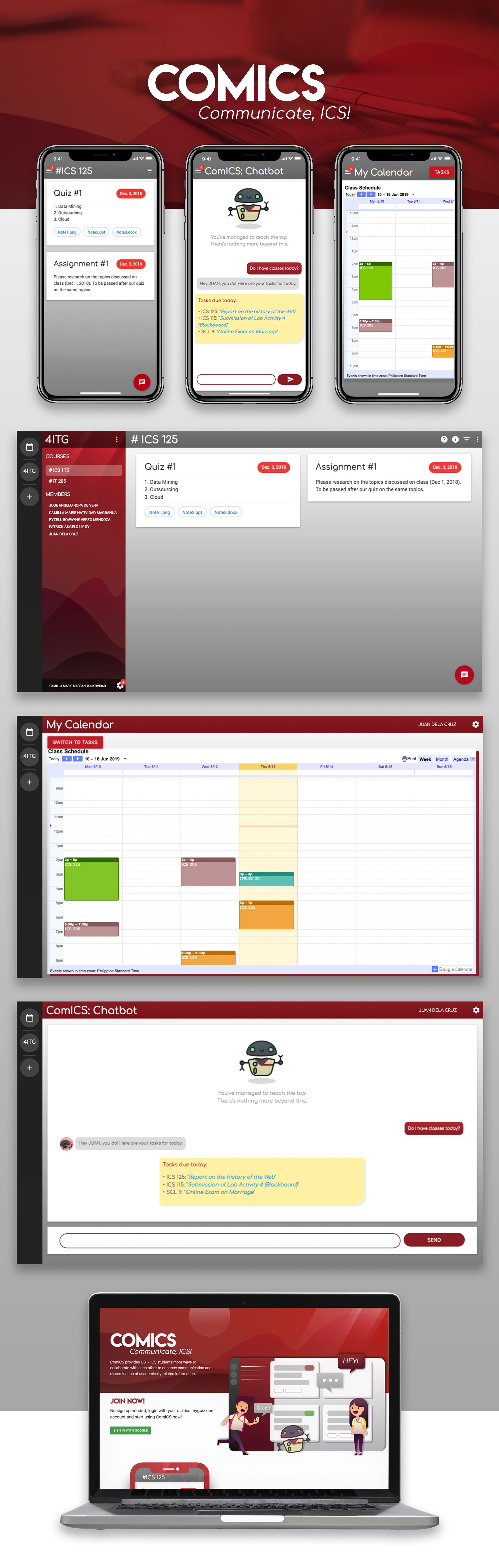 ComICS is short for "Communicate, ICS!", a responsive web application that provides the students tools to collaborate with their block section in terms of academic information dissemination. It also provides an in-app chatbot that easily provides students their schedules, tasks, and other important information regarding schoolwork.